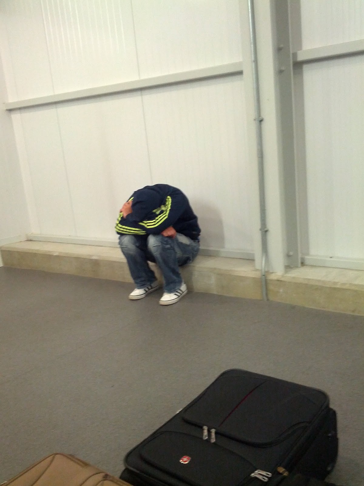 návratu na nádraží jsem spolucestujícím líčil zážitky z "mekáče" a Milan mi dal bagetu, "byl sem vděčnej za každej kus něčeho." Tomáš odpočíval a mi jsme si vyprávěli vtipy. Byly skoro čtyři ráno tak jsme šli pomalu na letiště.